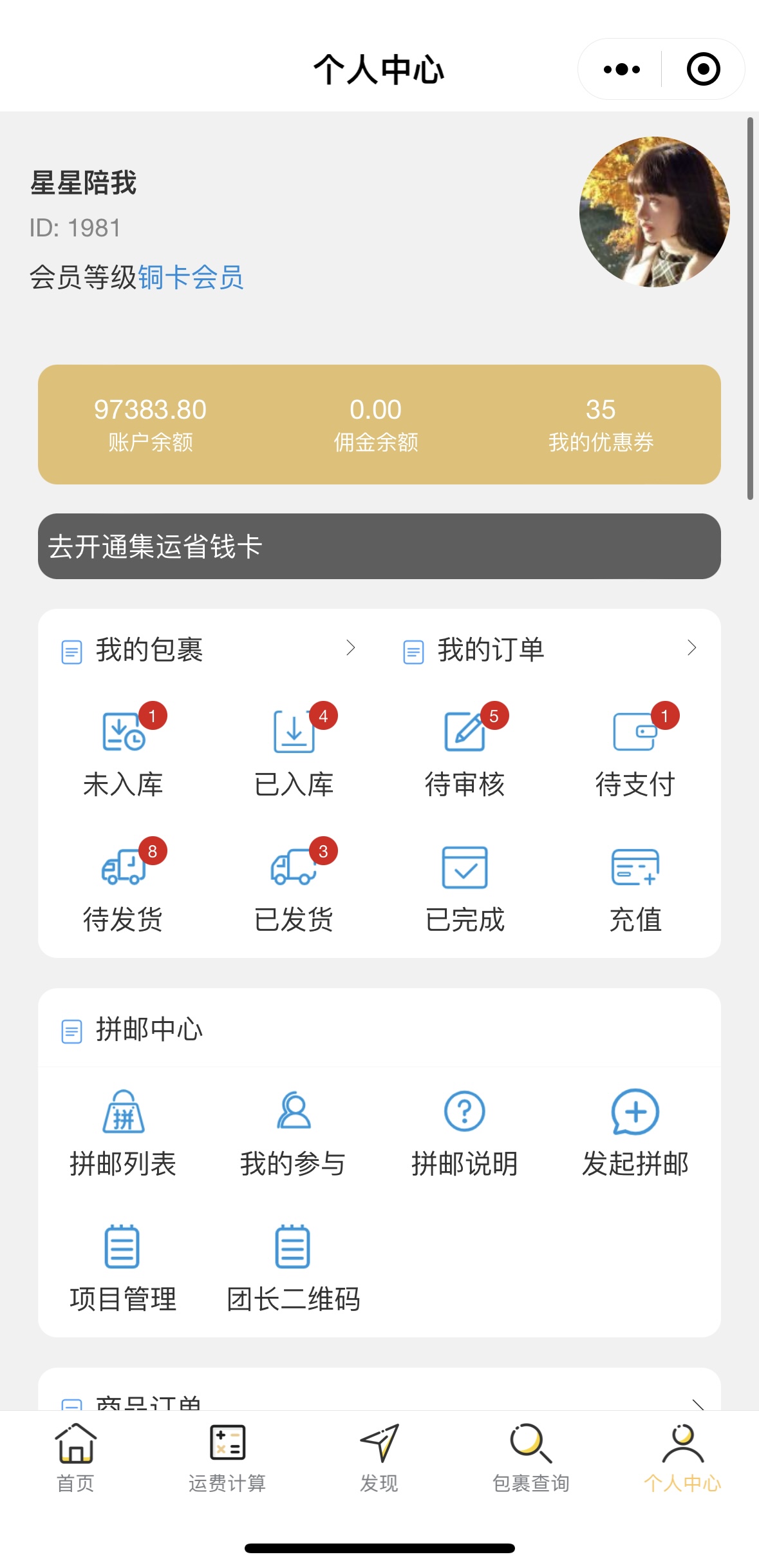 嗨轉(zhuǎn)寶集運小程序清晰明了的訂單管理系統(tǒng):待打包、待支付、待發(fā)貨、貨到付款、已發(fā)貨一目了然